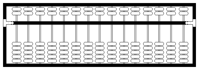 I am learning by practicing on my wooden abacus. I'd like to show you sone techniques for manipulating it for arithmetic. The little manual that is my guide has been hard to follow since its english is not very clear, and cramps many stages of a process together. I hope that my presentation here using pictorial examples with my own comments will put across the message. Below is a diagram of an abacus (a hybrid of the two I have).