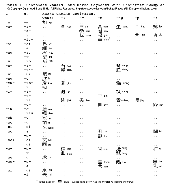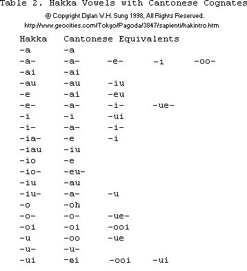 We shall compare the sounds of Cantonese and try to establish their equivalent relationships in Hakka. Below is a table of the relations found between the two dialects, sorted by the type of endings horizontally, and by the various vowel and equivalent in Hakka.