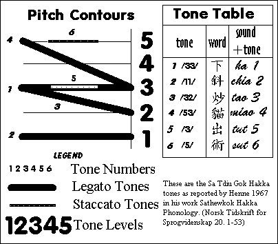 So far we have concentrated on the two short tones. Of the other legato or long tones, the Moi Yen dialect has tone 3 simialr in pronunciation to tone 5. In fact this is reflected in Hashimoto. I was puzzled for a while why this was so, since he adopts two tone marking systems; one, a numerical system as described above, and the other a graphical system of angle lines to a vertical stem. He had only five unique graphical tone markers. On reviewing his work again, we realise that the pitch contours he used for the Moi Yen dialect has the same tone level vales in tones 3 and 5. In the Chung Shan dialect, (1: /24/)(2: /11/)(3: /42/)(4: /55/)(5: /1/)(6: /5/), the staccato tones 5 and 6 mirrors tones 2 and 4 respectively, giving the appearance of four basic tones. In my own Shataukok dialect, tone 5 near-mirrors that of tone 3 instead of tone 2. Tone 6 near matches that of tone 4. (With staccato, the abrupt stop produces one level, whilst in legato, sounds are elongated slightly bring the tone level down a level).